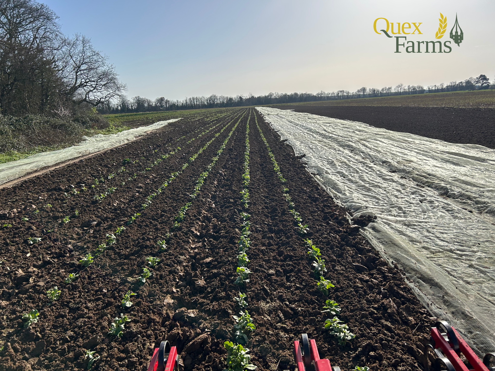 These newly planted crops are currently under fleece, which helps to create a slightly warmer microclimate around the plants. This encourages quicker germination and establishment during the cooler early spring period. The fleece also provides protection from pests, particularly pigeons, which can quickly damage young plants if left unprotected.